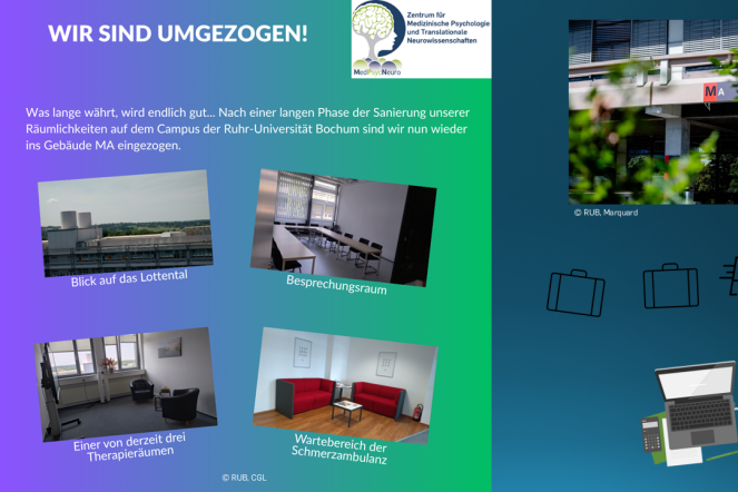 Die Abteilungen für Medizinische Psychologie und Medizinische Soziologie sowie Affektive Neurowissenschaften haben ihre Räumlichkeiten im Gebäude MA bezogen. Die Psychotherapeutische Hochschulambulanz befindet sich im Gebäude MB in der 7. Etage.