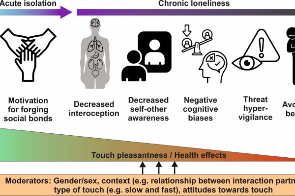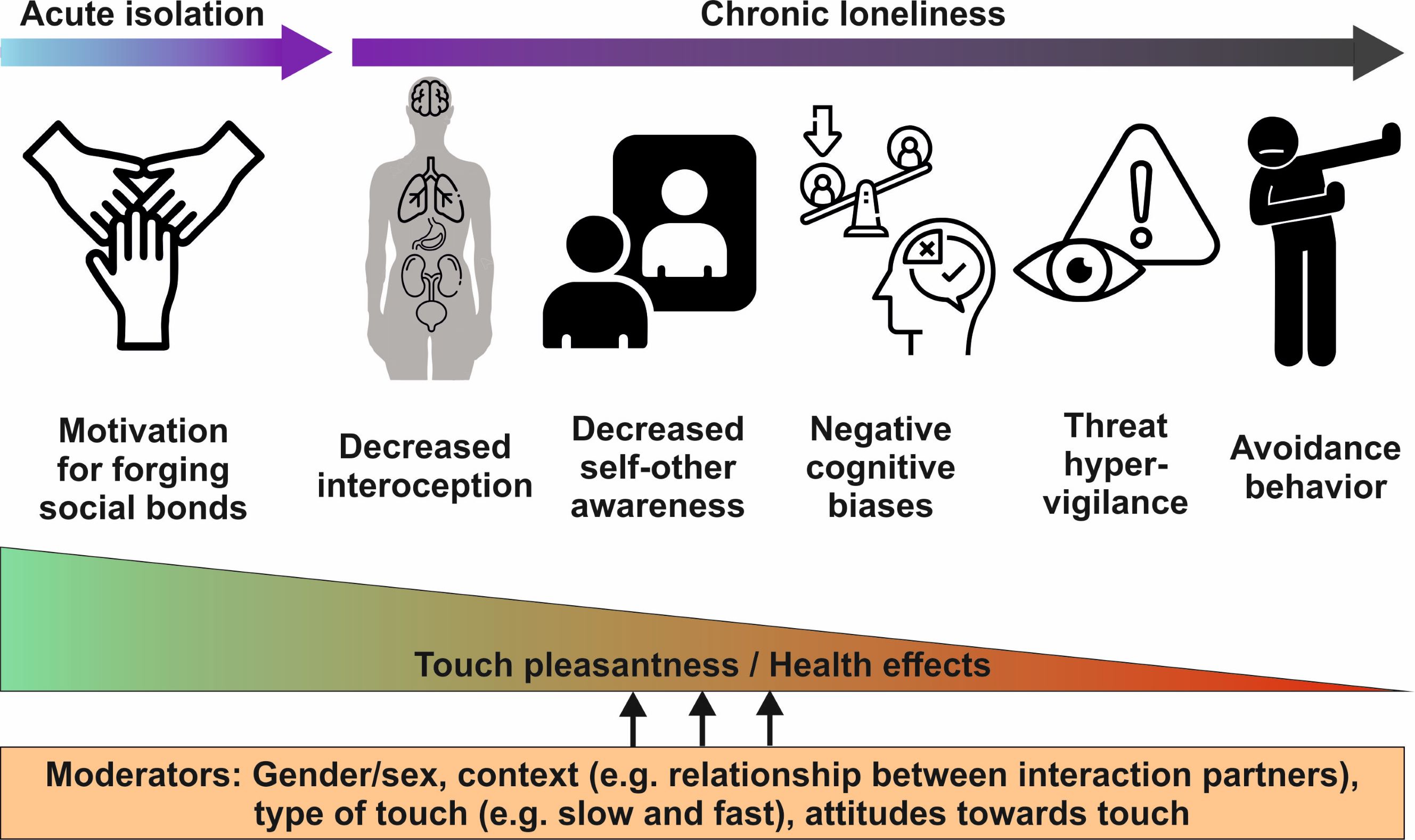 In unserem Artikel im Journal Current Opinion in Behavioral Sciences haben wir aktuelle Befunde zum Zusammenhang zwischen Einsamkeit und dem Erleben von Berührungen zusammengetragen. Außerdem haben wir ein Modell entwickelt, wie sich die Wahrnehmung und Wirkung von Berührungen je nach Dauer der bestehenden Einsamkeit unterscheiden.
